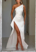 Sexy One-shoulder Backless Slit Dress Summer Elegant Slim-fit Solid Color Satin Dresses For Women